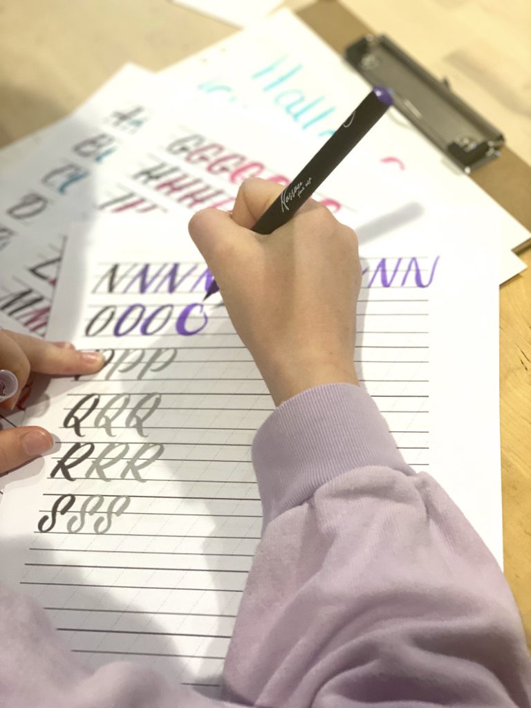 Zu Beginn wird eine Übung zum Schriftaufbau durchgeführt: Die Teilnehmenden entwerfen Buchstaben aus Grundelementen wie geraden Linien, Bögen und Schleifen, üben das Zusammensetzen von Groß- und Kleinbuchstaben und experimentieren mit Proportionen sowie Verbindungen für harmonische Wortbilder.